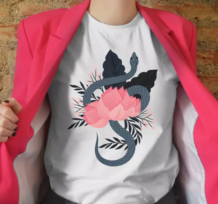Introducing our striking Snake and flower motif t-shirt, a perfect fusion of modern artistry and nature's beauty! This design features a captivating snake intertwined with a lotus, surrounded by lush leaves and delicate petals, all beautifully stylized in shades of pink and black. The botanical elements create a vibrant yet harmonious look that is sure to turn heads and express your unique style!