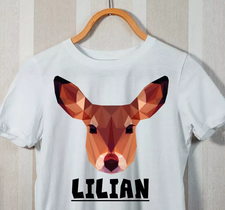 Introducing our Stylish deer head t-shirt that beautifully combines contemporary fashion with whimsical flair! This unique design features a geometric depiction of a deer or reindeer face, crafted in a playful cartoon style with a polygonal effect. Personalize it with a custom name, making it not just an animal-themed tee but a perfect expression of your individual style!