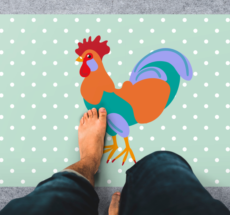 Bring a splash of joy to your space with our Animal vinyl rug with colorful rooster design. This vibrant rug features a playful illustration of a rooster set against a pattern background adorned with cheerful polka dots. Its cartoonish design radiates fun and energy, making it a fantastic addition to any room!