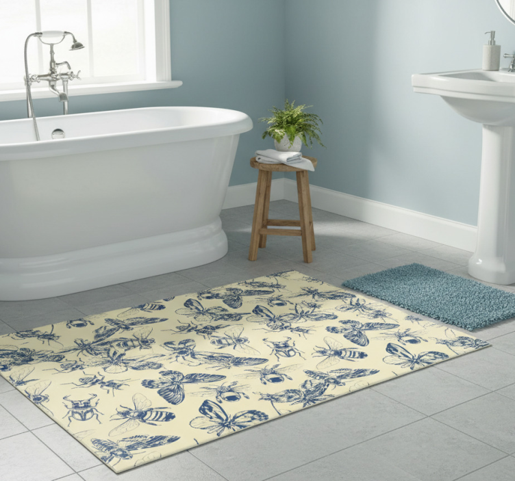 Bathroom vinyl rug with blue and yellow bees and butterflies