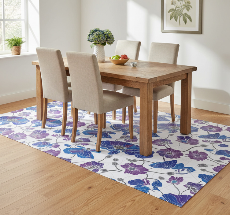 The Floral vinyl rug with blue and purple garden flowers floral vinyl rug is a fantastic choice for adding a splash of color to your home! Its eye-catching design effortlessly enhances your decor, creating a warm and inviting environment. Perfect for living rooms, bedrooms, or play areas, this rug not only beautifies your space but also serves as a protective layer for your floors. Enjoy the charm and elegance it brings to every corner of your home!