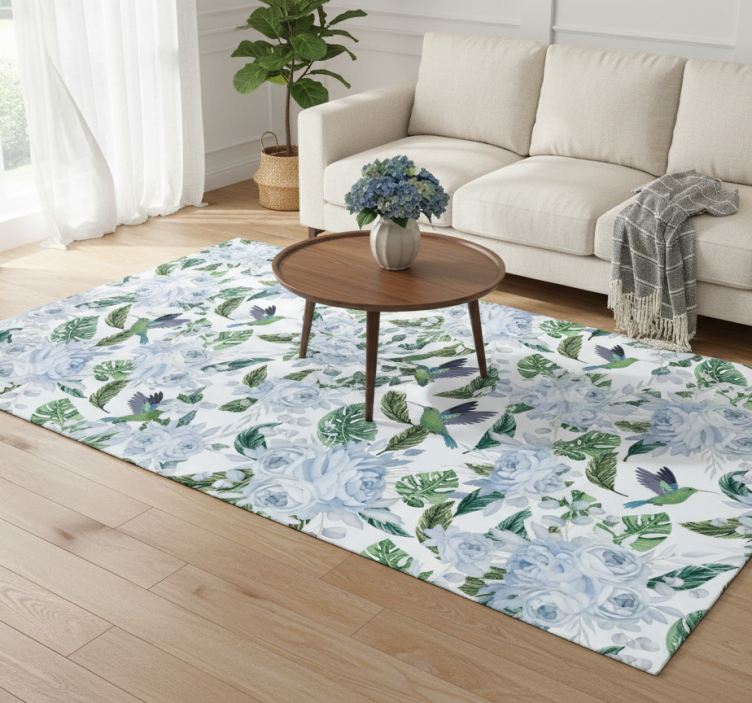 The Floral vinyl rug with blue garden flowers and birds floral vinyl rug is perfect for those looking to infuse their home with elegance and charm. Its enchanting floral patterns and lively bird motifs make it a captivating focal point in any room. Imagine stepping onto a soft, beautiful surface that instantly brightens your day and transforms your space into a serene oasis!