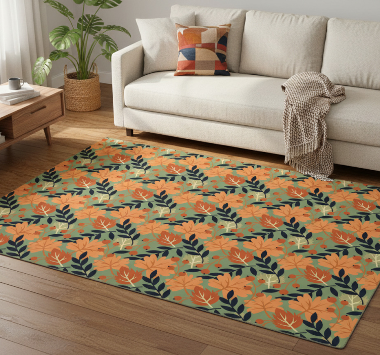 Transform your living space with our stunning Floral vinyl rug with large autumn leaves design. This eye-catching piece features vibrant autumn hues and beautifully detailed leaves, perfect for adding a touch of seasonal elegance to any room. The design is not only visually appealing but also incredibly practical, making it an ideal choice for homes looking to combine style with functionality.