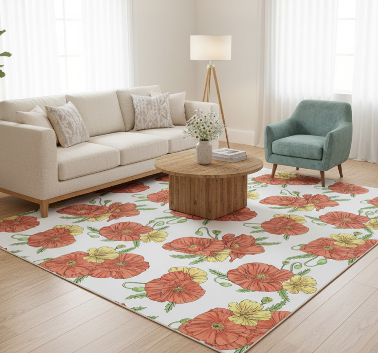 The Floral vinyl rug with poppy flowers on white background floral vinyl rug is an ideal choice for decoration because it brings a burst of color and life to any environment. Imagine stepping into a room adorned with this charming rug, instantly elevating the mood and creating a welcoming atmosphere. Its exquisite floral design not only complements various interior styles but also serves as a delightful focal point that sparks joy and creativity in your home.