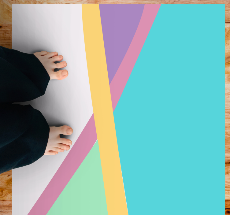 Introducing the stunning Modern vinyl rug colorful abstract layers, a delightful addition to any space! This vibrant piece features a unique design filled with stripes, geometric patterns, and colorful shapes that blend harmoniously in teal and pastel tones. Perfect for those who appreciate abstract art, this rug brings life and energy to your home!