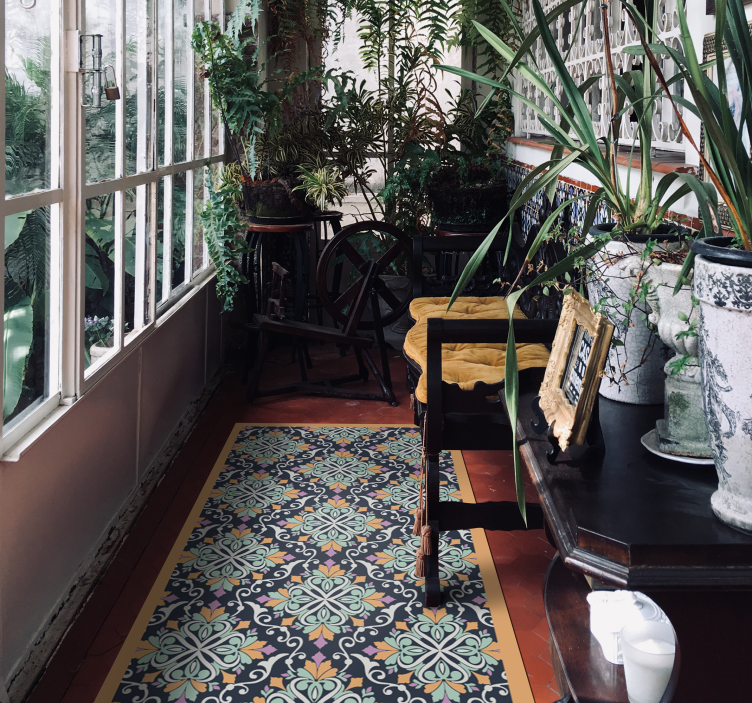 The Mosaic Inspired Pattern mosaic vinyl rug features a stunning design that incorporates tile, tiles, ornamental, pattern, patterned, floral motif, colorful, and vivid elements. This eye-catching vinyl rug is perfect for adding a touch of elegance and personality to any room!
