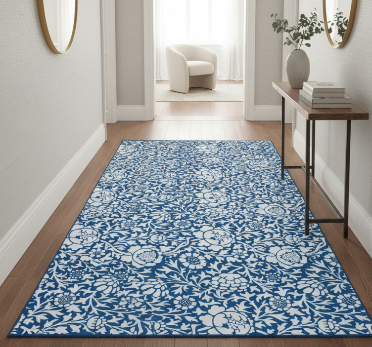 The Nature vinyl rug in marine blue floral design nature vinyl rug is the ultimate decorative piece for your living space! Its beautiful floral patterns and rich colors create a welcoming atmosphere, inspiring warmth and charm in any room. Transform your home into a tranquil retreat where style meets comfort, inviting you and your guests to relax and enjoy.