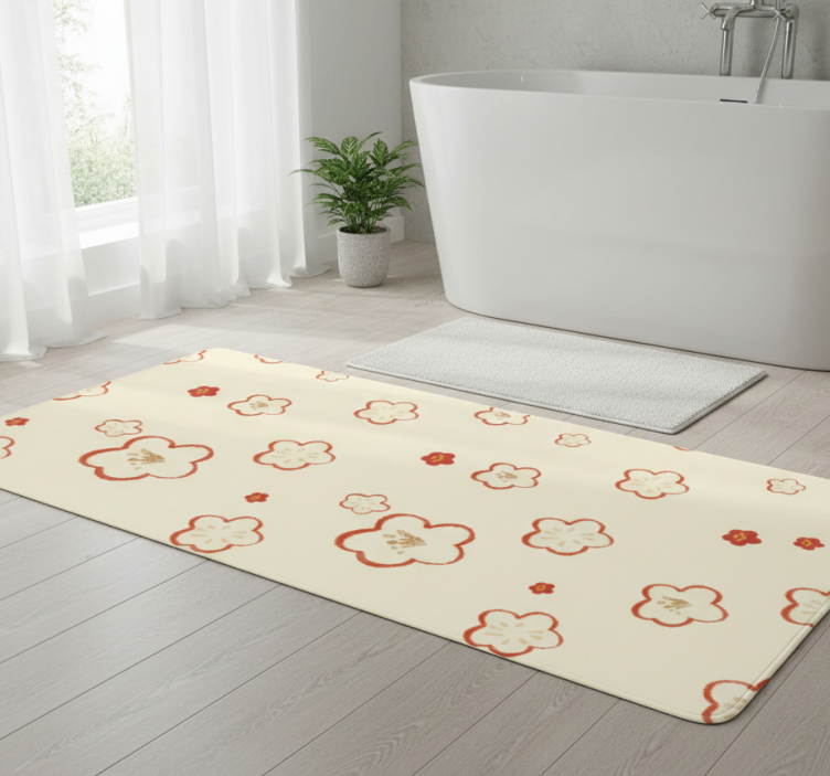 The Red and cream daphne flower pattern bathroom vinyl rug is the perfect choice for those looking to elevate their space. Its striking floral design instantly adds warmth and personality to your bathroom, making it not just a utility item but a decorative statement piece. Elevate your everyday routine and make your bathroom a delightful retreat!