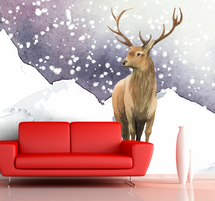 Transform your space with our stunning Animals wall mural majestic deer scene. This exquisite design captures the beauty of a stag standing gracefully amidst a winter wonderland, featuring snow, majestic mountains, and a serene watercolour style that brings the wildlife to life. The enchanting deer radiates tranquility and elegance, making it a perfect addition to any room.