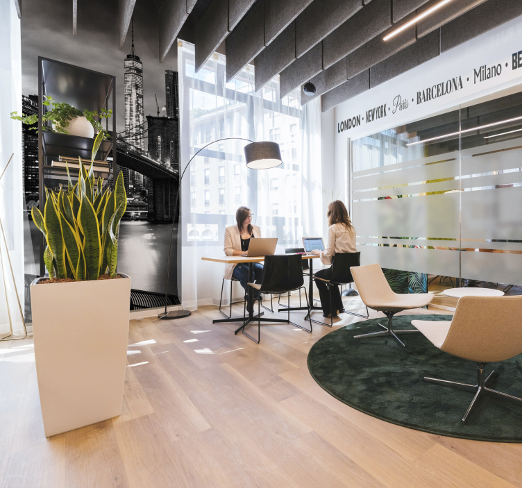 Reference: F12189A modern office space features two individuals engaged in a meeting, with a striking city skyline mural showcasing iconic landmarks. A vibrant plant adds a touch of nature, enhancing the interactive environment. The design emphasizes a blend of urban life and professional collaboration.