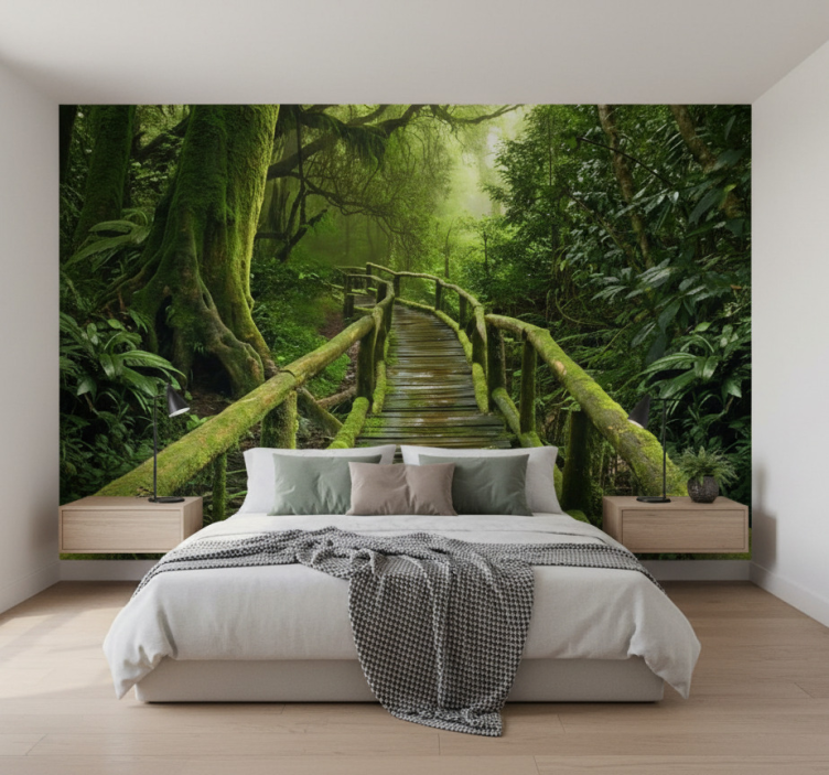 The Forest wall mural lush mossy boardwalk forest wall mural is more than just a decoration; it is an invitation to escape into nature from the comfort of your home. Imagine stepping into a serene forest every day, where the calming presence of moss-covered boards and vibrant foliage ignites your imagination. This mural not only enhances the aesthetics of any room but also instills a sense of peace and tranquility, making it an ideal choice for anyone looking to uplift their living space!