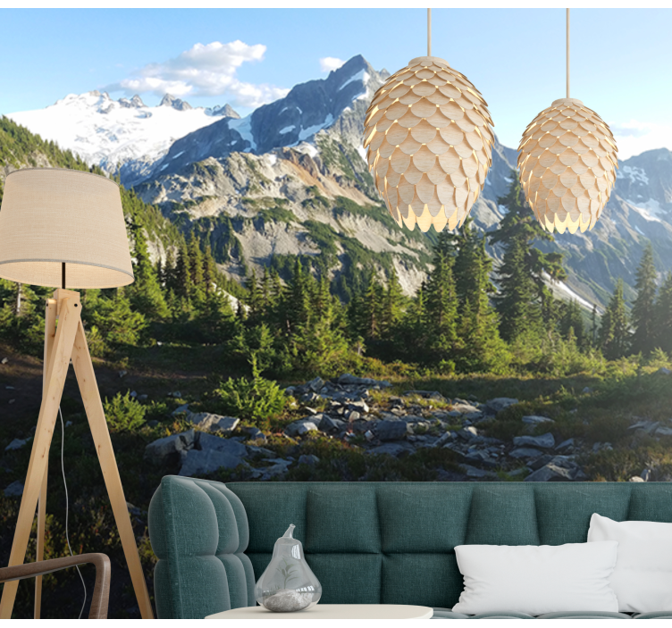 Transform your space with our stunning Landscape wall mural mountainous forest scene. This exquisite design captures the breathtaking beauty of nature, featuring majestic mountains, serene snow-capped peaks, lush trees, and a vibrant forest landscape. It brings the tranquility of the outdoors into your home, creating a peaceful and inviting atmosphere.